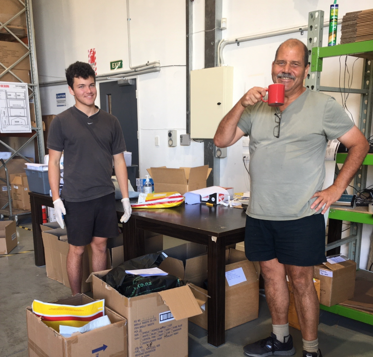 Lewis and Glenn packing orders in our “covid Bubble”. The rest of the team stayed safe at home.