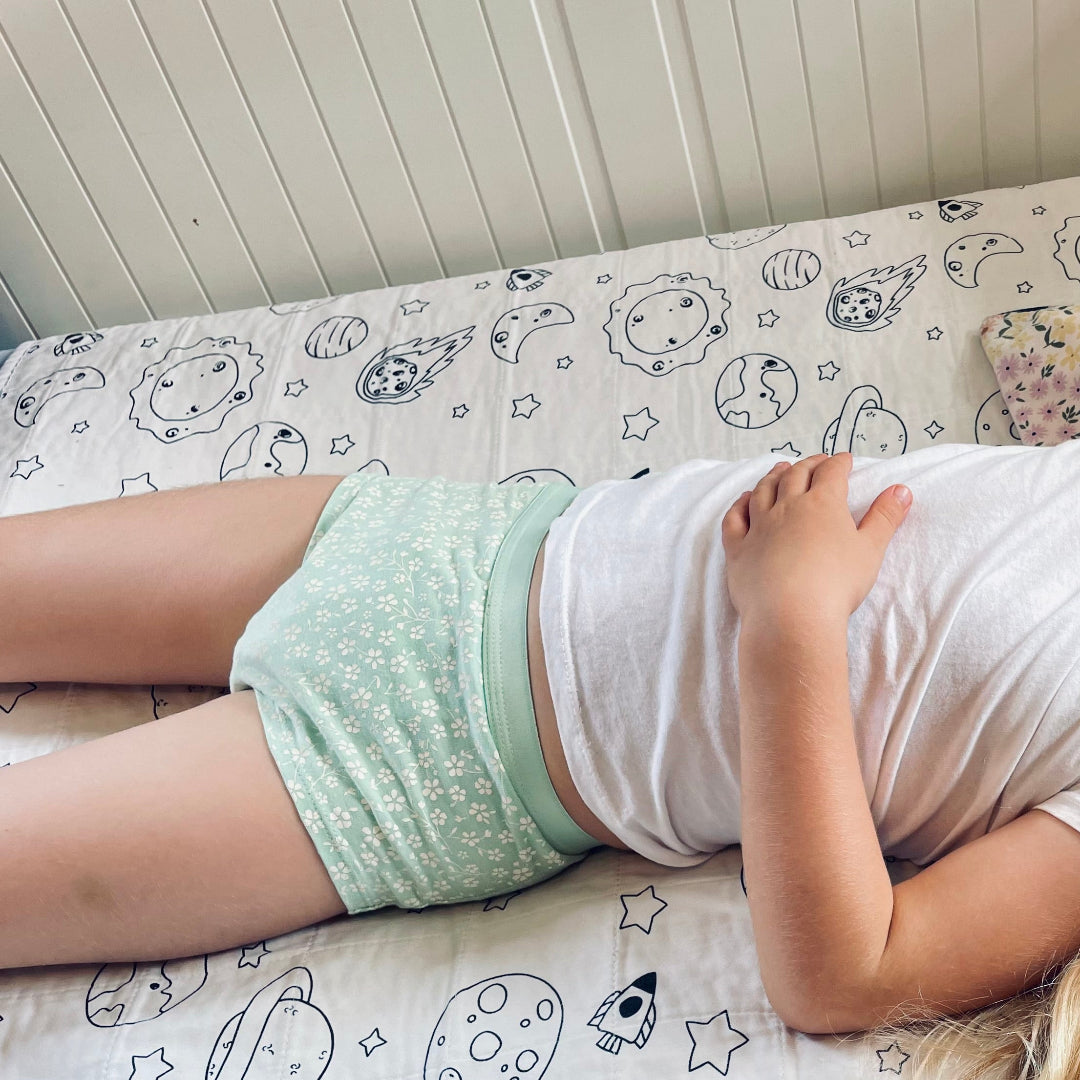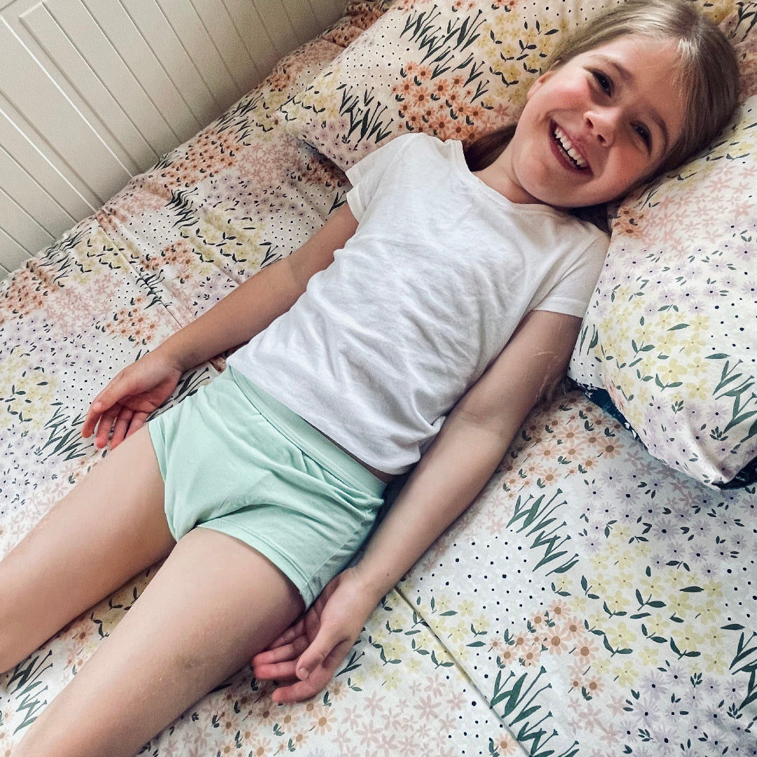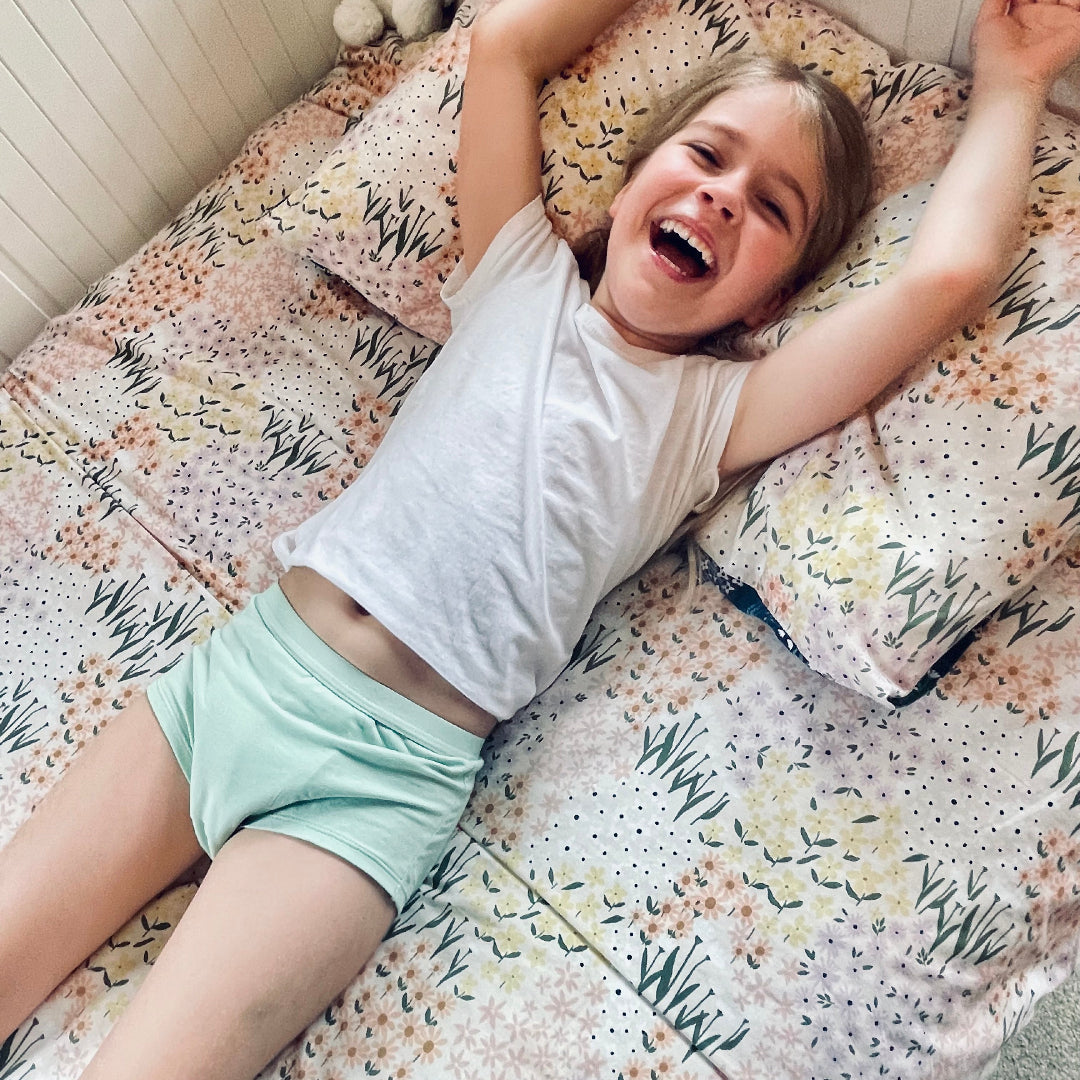 They are ideal for kids who are almost dry at night, but are not quite there yet. With our top layer of cotton, your child will be able to feel the wetness, which in turn can help them to wake. Snazzi Pants are not a disposable nappy, so they will not hold a huge wee; rather, they are designed for your child to feel the wetness and for their brain to start to get the message about being wet. And they look and feel just like undies!